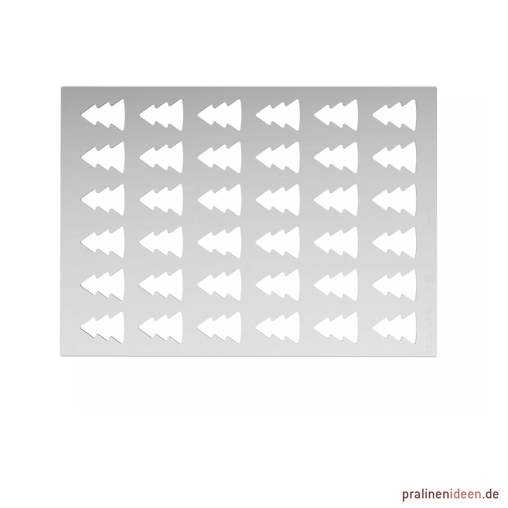 | Pralinenhohlkörper in Tannenbaum-Form aus weißer Schokolade, 1 Lage mit 42 Stück, Gewicht pro Hohlkörper 4,7g, Maße (Länge x Breite x Höhe) 39mm x 30mm x 15mm