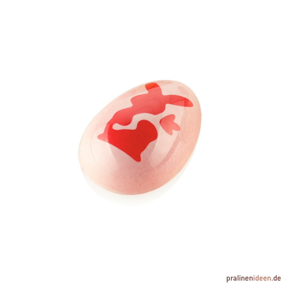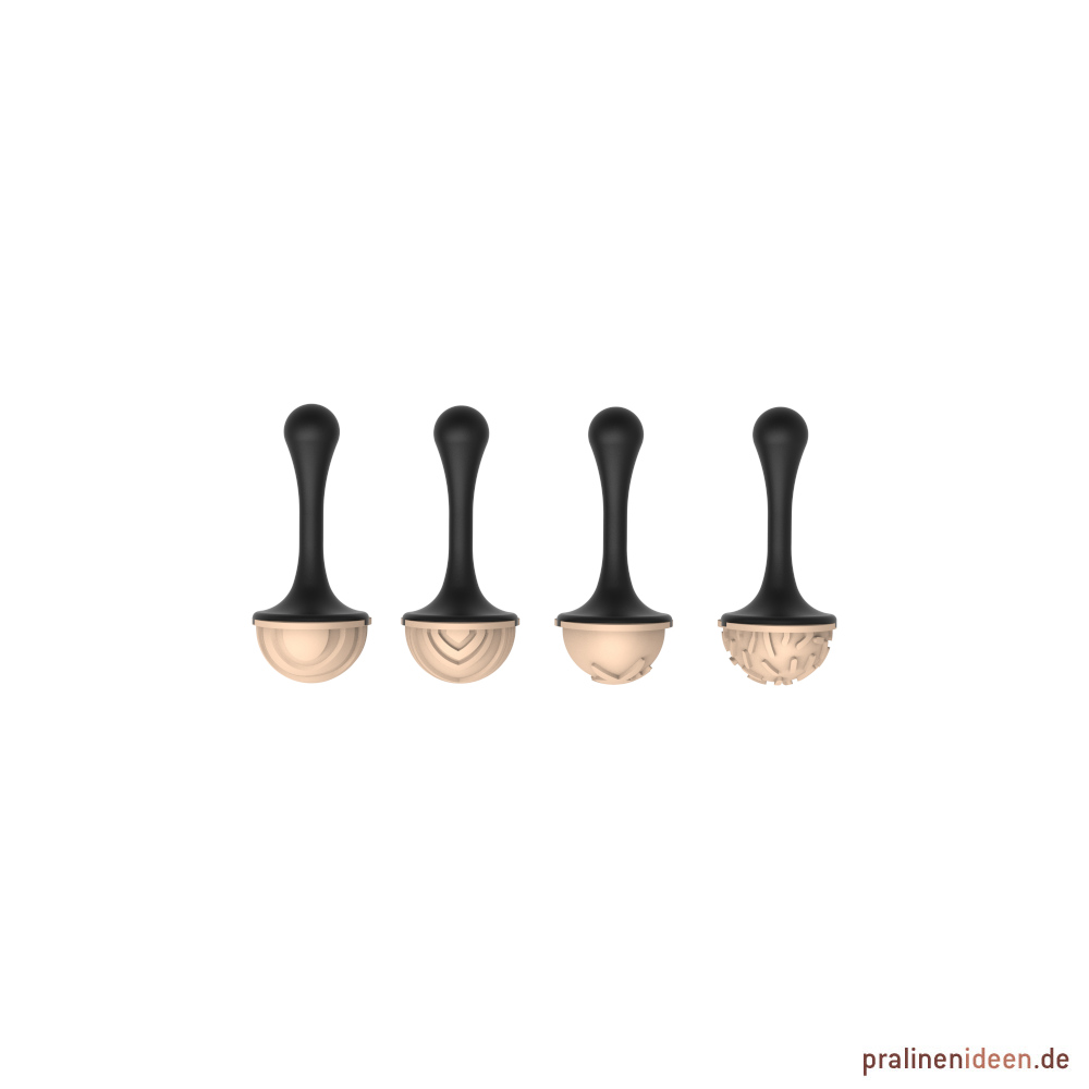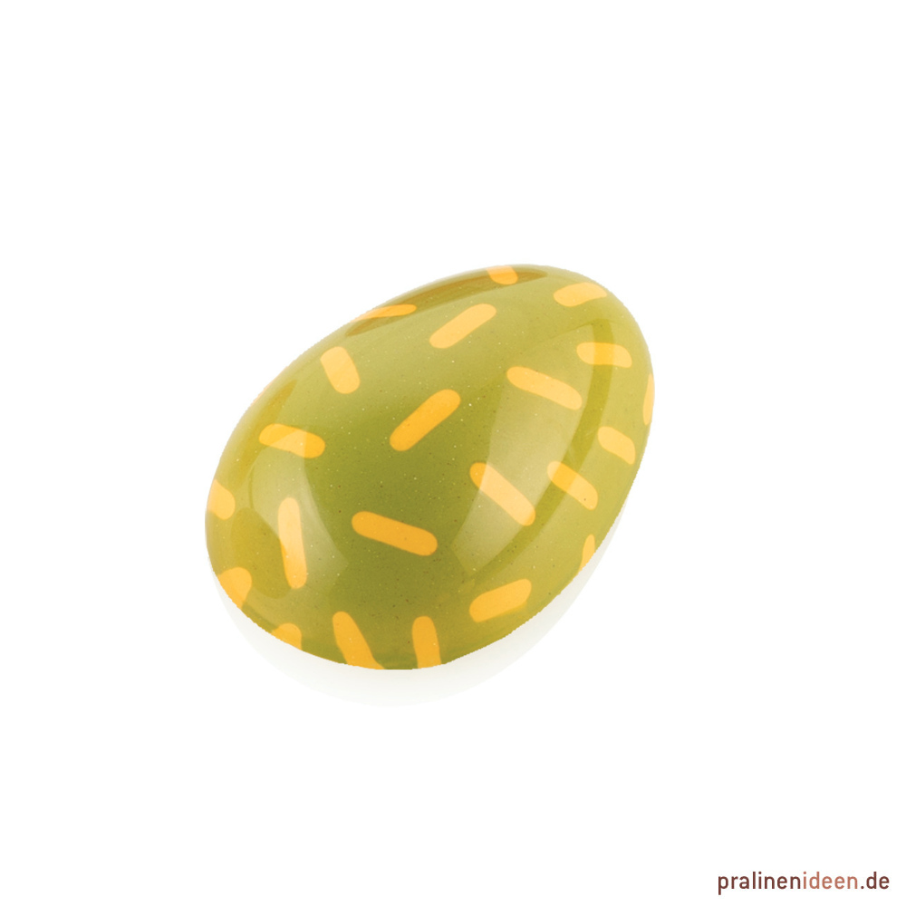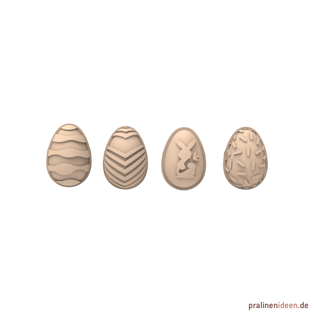Das Set beinhaltet eine Polycarbonat-Halbeiform und vier dazu passende Silikon-Stempel mit Oster-Motiven mit denen das Design der Stempel auf die Praline übertragen werden kann. Der Gebrauch der Stempel ist unter www.youtube.com/watch?v=FOJJE_6XKd0 zu sehen.